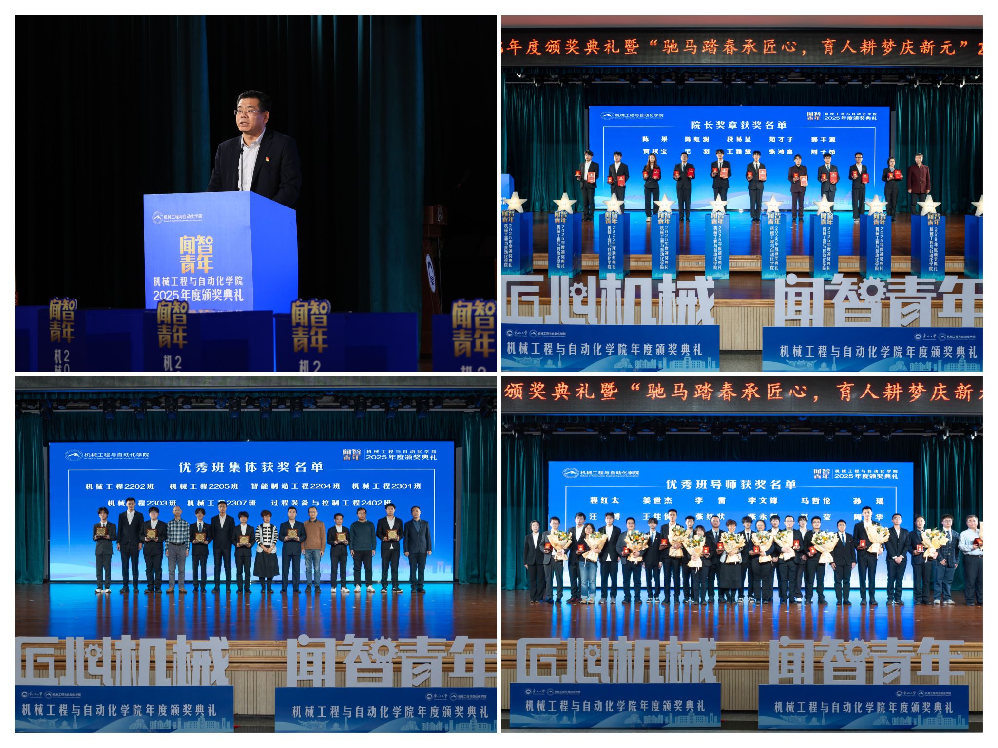 学院党委郝建山正在致辞中系统回首了一年来学院取得的主要成绩。学院积极办事国度计谋,投身深度金属矿智能开采纳配备全国沉点尝试室扶植,并正在环节科研范畴实现标记性冲破,获得国度严沉专项支撑。同时,学院成功引进增材取激光制制范畴领军团队,稳步推进学校新增学位点扶植,为久远成长奠基根本。正在人才培育方面,学院学子表示凸起,研究生学术丰盛,正在“挑和杯”“中国国际大学生立异大赛”等多项赛事中斩获国度级项,结业生就业率持续连结高位,展示了全面成长的优良素养。郝建山阐释了“闻智青年”品牌的育人内涵,勉励全体师生胸怀“国之大者”,将小我成长融入“制制强国”计谋,过硬本事,怯于立异创制,勤奋成为担任平易近族回复大任的时代新人。副院长罗忠表扬决定。颁环节分三轮顺次进行。起首颁布的是“院长章”,刘云飞为毛羽等10名正在专业进修、科技立异、社会实践等方面表示杰出的学生颁布章。随后颁布“优良班集体”项,班导师代表为7个正在班风、学风及凝结力扶植中成效显著的班级颁。最初,仪式聚焦育人一线论理学生代表向获评“优良班导师”的教员们献上鲜花取荣誉证书,表达诚挚感谢感动。“院长章”获得者代表毛羽连系科研竞赛取意愿办事履历,讲述了“道阻且长,行则将至”的成长;“优良班集体”获代表豆煜轩分享了班级凝心聚力、共建优秀学风的活泼经验。正在“闻智匠心 共话青蓝”出格环节,优良班导师马哲伦取所带班级学生代表刘定佳同台交换,从分歧视角展示了师生间思惟引领、学业互帮、讲授相长的温情互动,彰显了育人一线的深挚交谊取结实成效。据悉,“闻智青年”是机械工程取从动化学院出力打制的文化育人品牌。本次颁仪式既是年度的集中展现,也是典型树立、激励朝上进步的主要平台,旨正在指导全体学生以先辈为楷模,坚想、夯实专业根本、勤奋成长为具有家国情怀、全球视野取创制活力的杰出工程人才,为学校“双一流”扶植和高质量成长注入芳华力量。